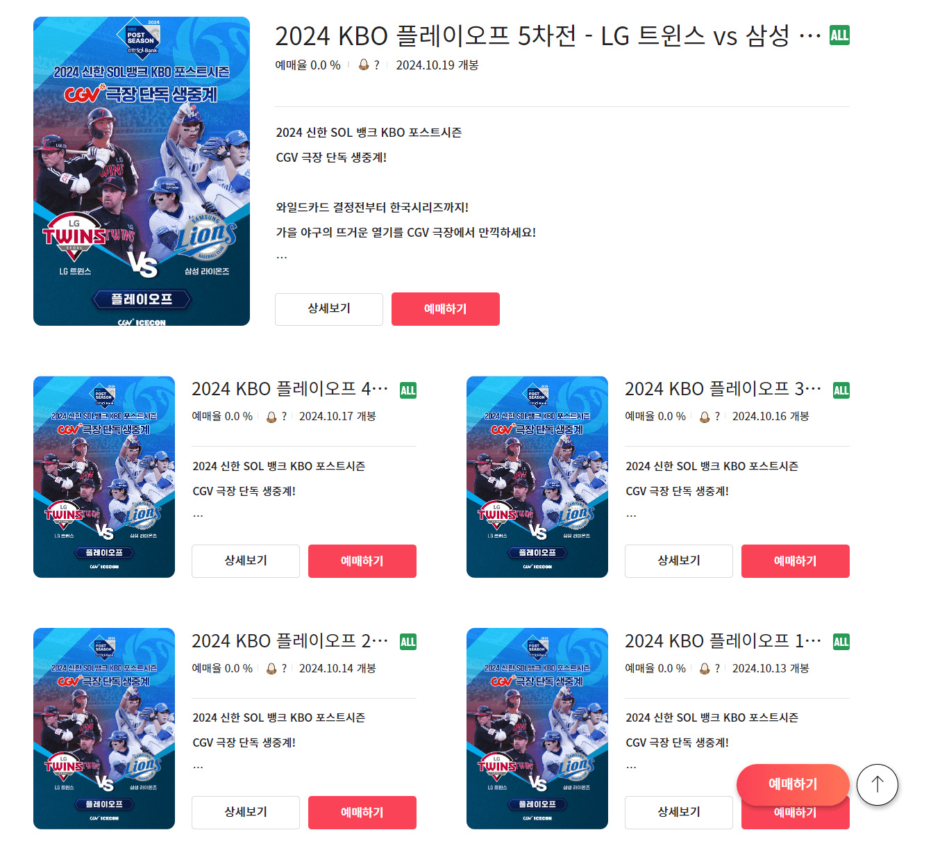 플레이오프 직관 예매가 어려우신 분들은 CGV 영화관에서도 관람이 가능합니다.